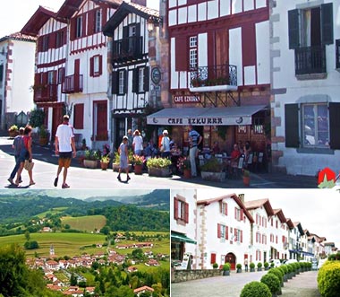 教会のあるメインストリートには、白壁に赤や緑のバスク色の木枠が映えるバスク建築の美しい家並みが続いています。
